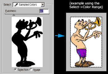 Once you have a nicely cleaned up image, use the Magic Wand to select all the white space around your image and within the enclosed areas. If this doesn’t work (i.e. there are still too many junk pixels) try making white (or the prominent color of the junk pixels you are having trouble removing) your foreground color, and choose Select » Color Range. This won’t work well if you have a lot of white (or the junk pixel color) that’s actually part of your image, since it will be selected as well (if this happens and all else fails, go into Quick Mask Mode and re-color in the areas you want to keep – Quick Mask is like “painting in your selection area”).