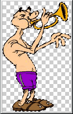 The first step will need to be to get rid of ALL of those extra dots or as many as possible so we can make a perfect selection around the image itself. Basically, you must have an image with perfectly clean edges all the way around, so that a perfect selection can be made later on with the Magic Wand. If your image is “part” of another larger image, the same applies – remove everything completely from around the image. Use the Zoom tool to get a super close-up of your image and then use the Eraser to remove the extra pixels from around the edges of your image, including enclosed areas (like the white space you see between the trumpet player’s neck and his right arm). The more accurate you are, the better your final product will turn out (these semi-transparent pixels will come back to haunt you when your completed transparent GIF is placed on a contrasting background… so zap ’em while you can!).